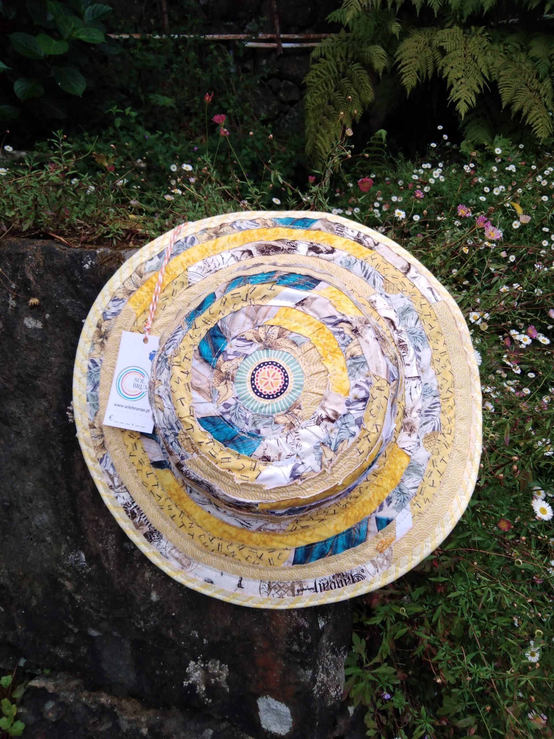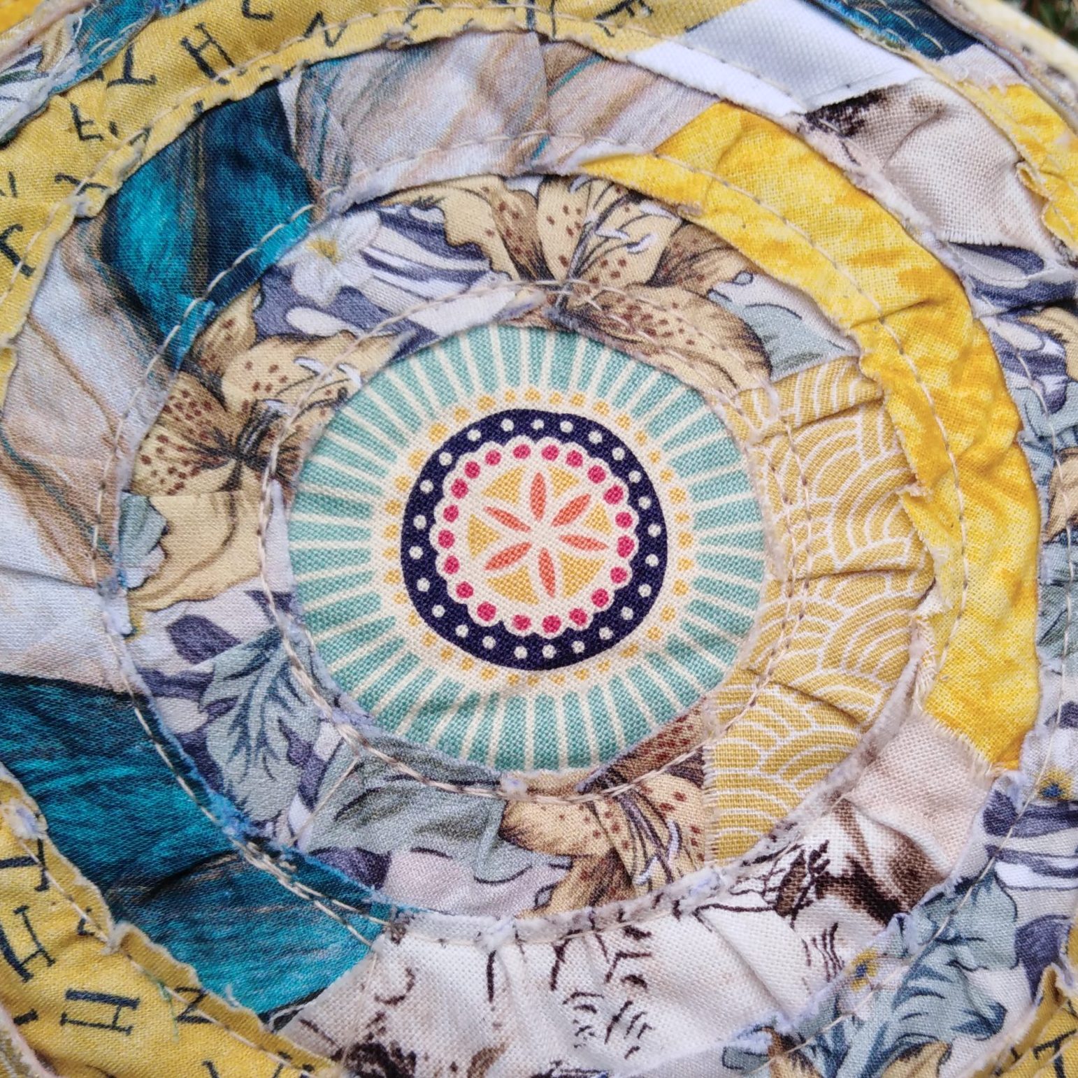 Created with overlapping fabric strips in a circle and sewn together.
