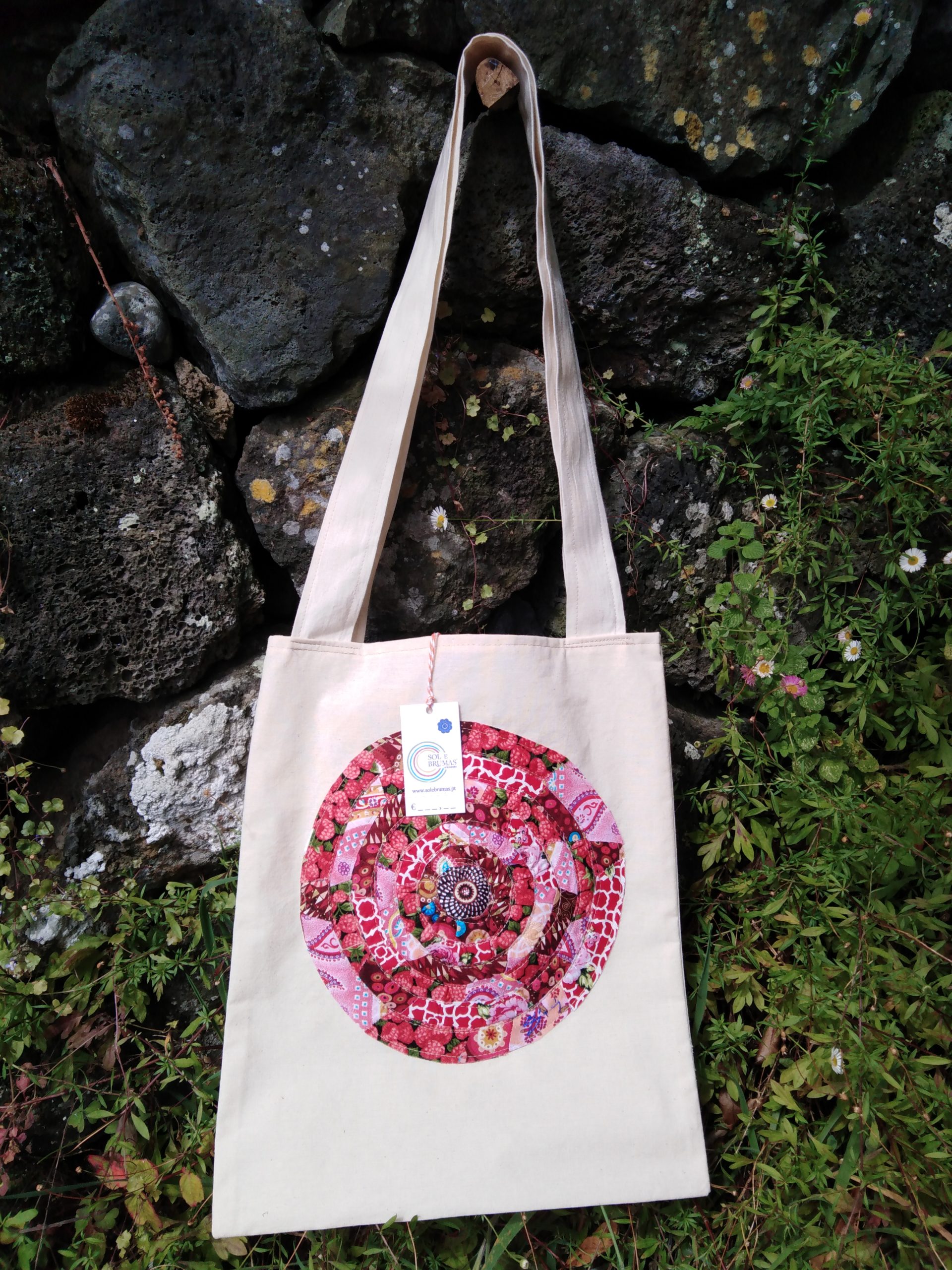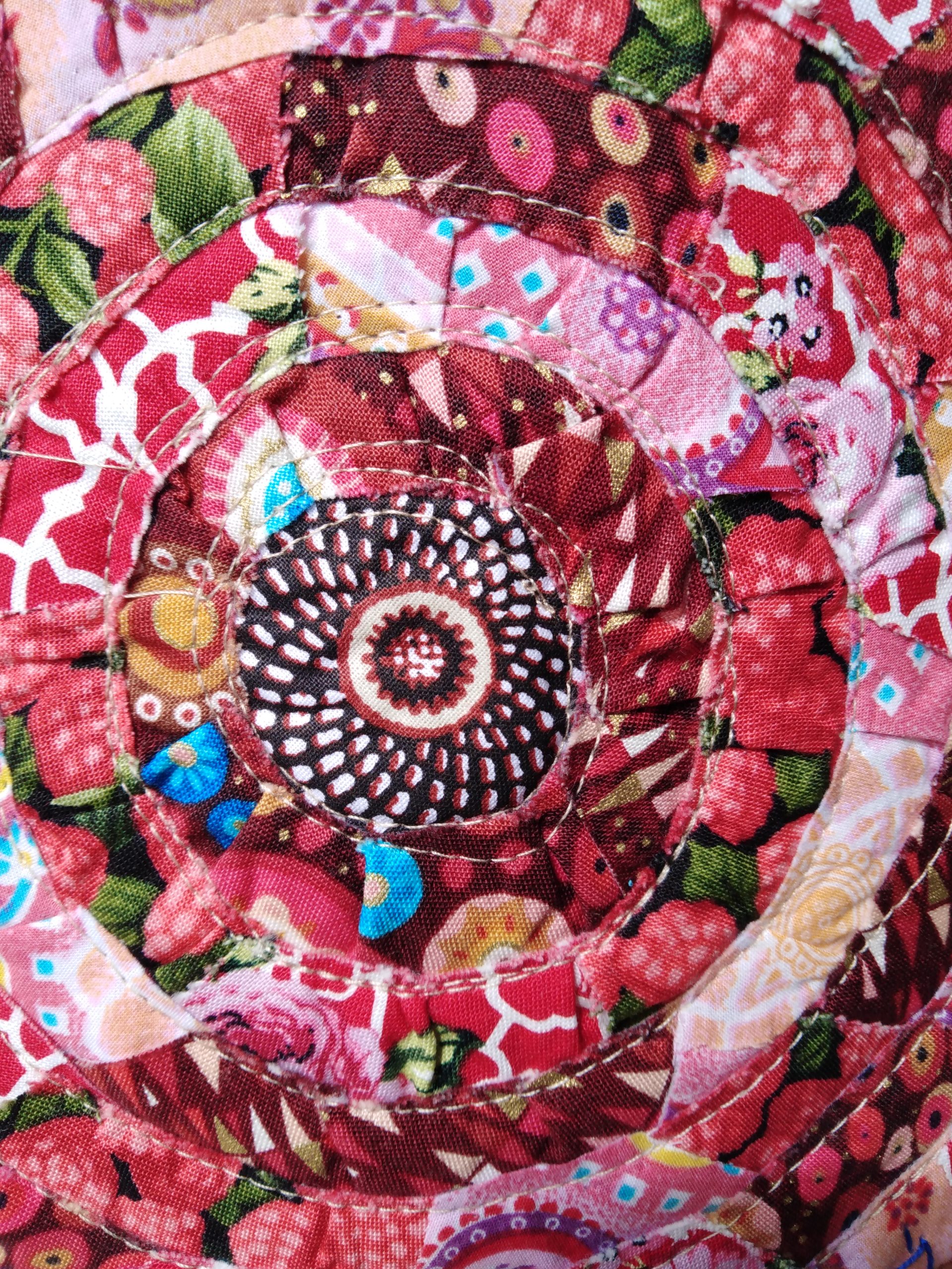 Peça criada com tiras de tecido sobrepostas em círculo e costuradas