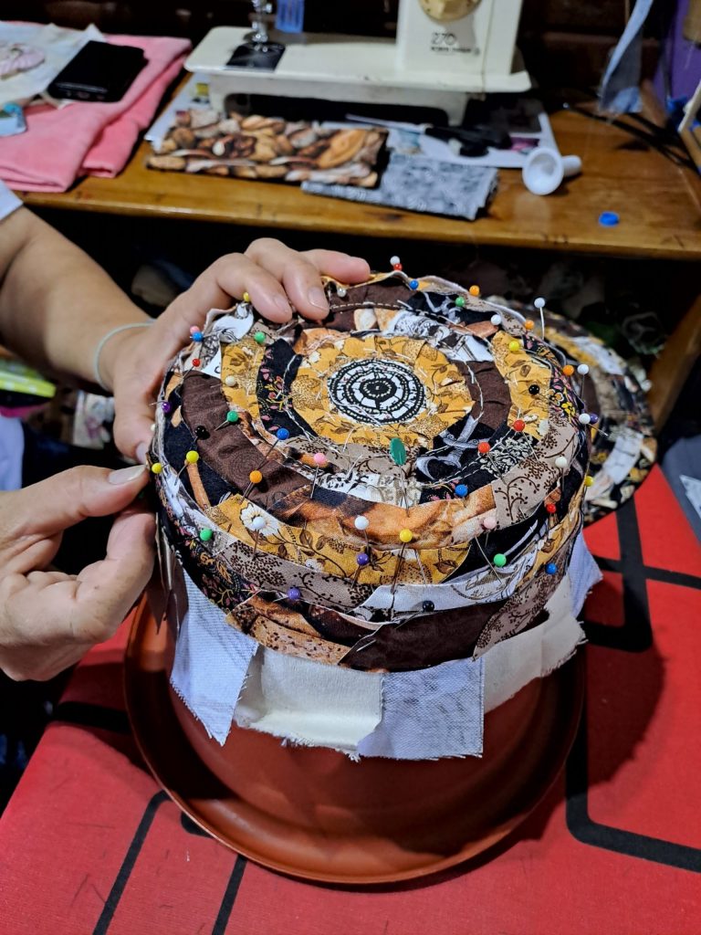 Cada peça produzida é fruto do tempo e dedicação da artesã que monta, corta, molda, alinhava e por fim, costura as tiras de tecido.